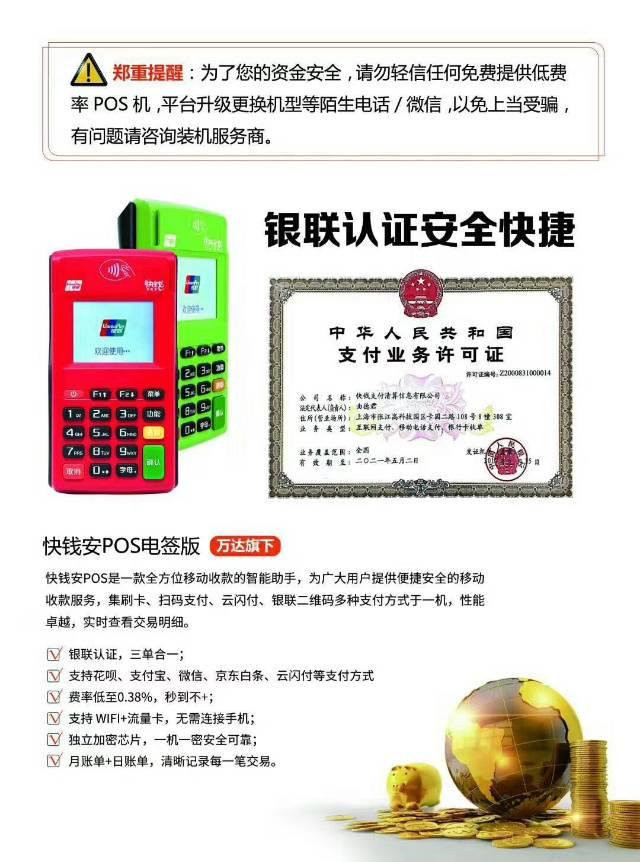 快钱是在2005年于上海成立,在目前就已经拥有6200万注册用户,并荣获中国信息安全产品测评认证中心颁发的“支付清算系统安全技术保障级一级”认证证书和国际PCI安全认证的荣誉。是一家在国内拥有正规资质合法的pos机品牌公司,其快钱公司资金实力雄厚,费率是做到了很多用户满意的稳定不跳码,其中我们用户在使用的时候pos机刷卡秒到账。