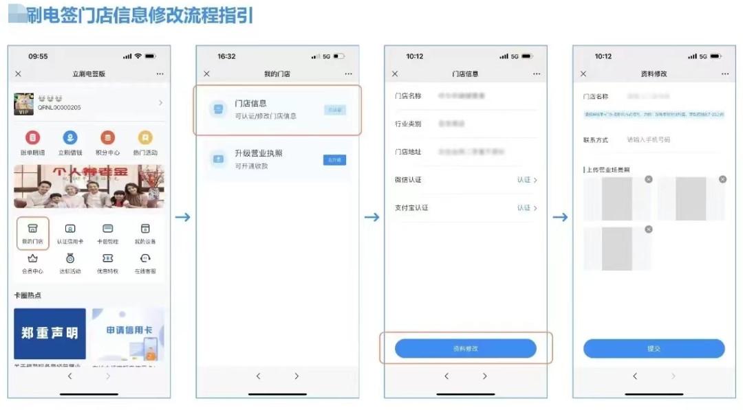 点击“我的门店”、点击“门店信息”、点击“资料修改”、根据提示修改对应的门店名称等信息。