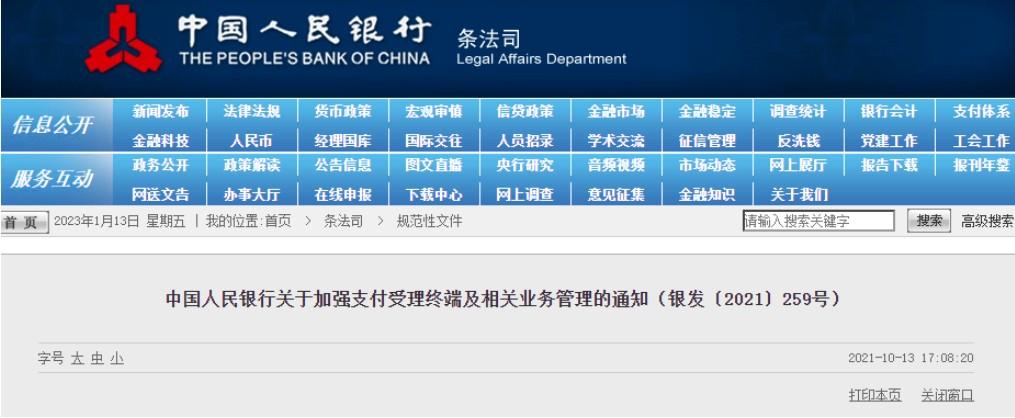 2021年10月13日中国人民银行发布《关于加强支付受理终端及相关业务管理的通知(银发〔2021〕259号)》。《通知》自2022年3月1日起施行。