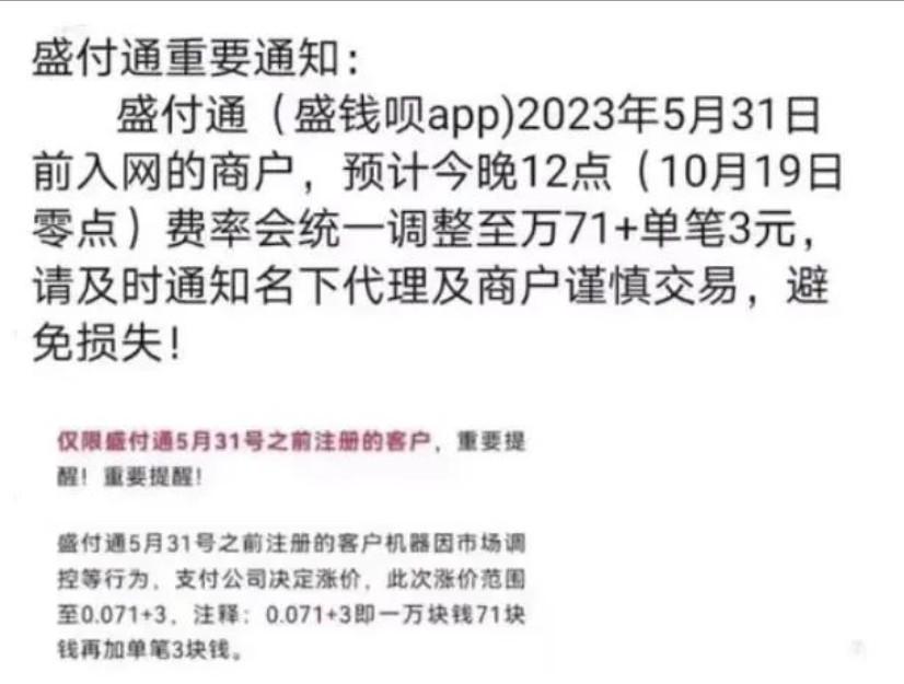盛付通(盛钱呗app)2023年5月31日前入网的商户,预计今晚12点(10月19日零点)费率会统一调整至万71+单笔3元,请及时通知名下代理及商户谨慎交易,避免损失!