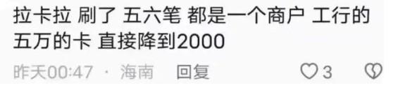 昨天刚有一个持卡人,用拉卡拉POS机器刷卡,五六笔都是显示同一个商户消费,工行额度五万的信用卡,直接降额至2000!