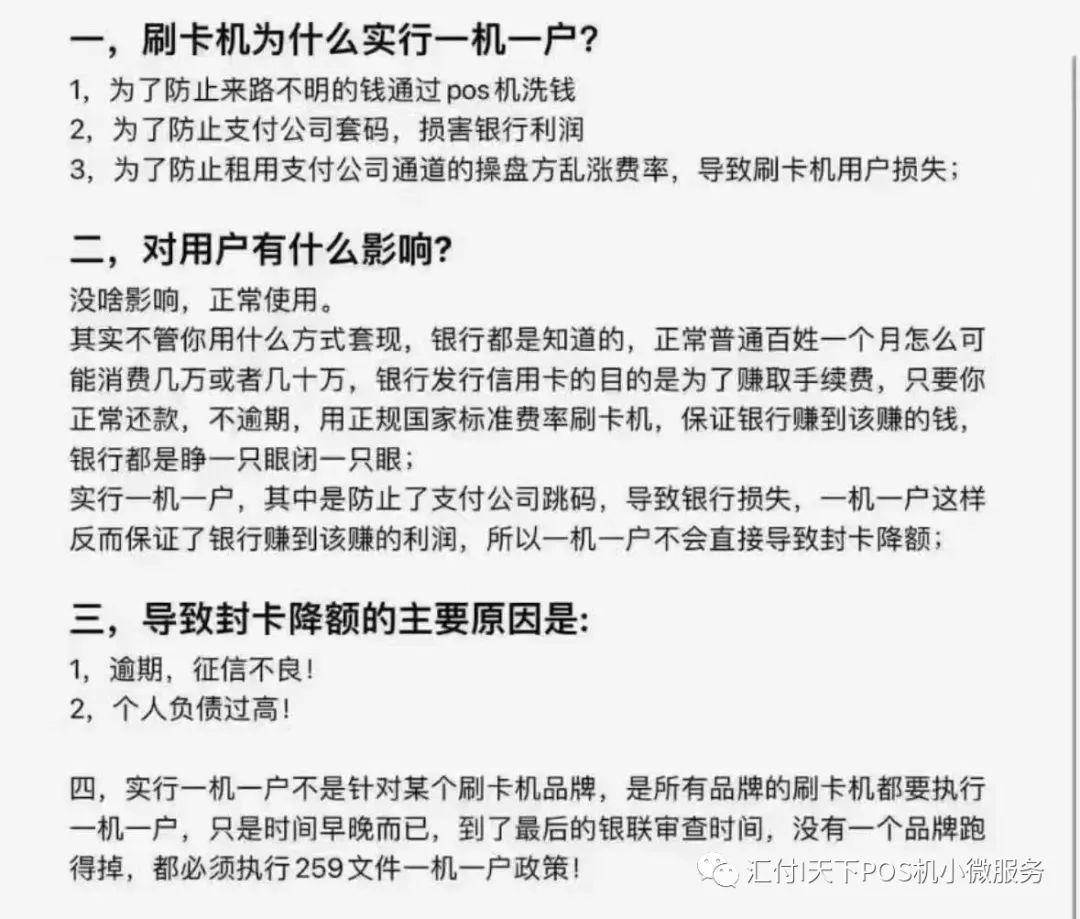 所以一机一户解决办法持卡人必须要多备两台稳定靠谱的POS机。等子弹多飞一会儿,看看发卡行是否改变风控规则。毕竟坏账太多也不是发卡行愿意看到的,毕竟全国来说需要养卡TX生存的人体量较大影响人们的基本生活。