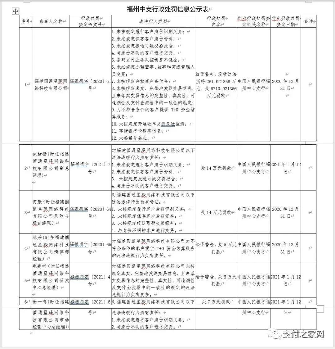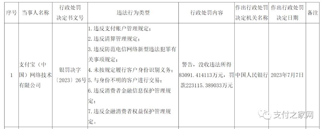 处罚事项:1.违反支付账户管理规定;2.违反清算管理规定;3.违反防范电信网络新型违法犯罪有关事项规定;4.未按规定履行客户身份识别义务;5.与身份不明的客户进行交易;6.违反消费者金融信息保护管理规定;7.违反金融消费者权益保护管理规定。