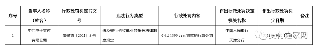 处罚事项:违反支付业务规定。