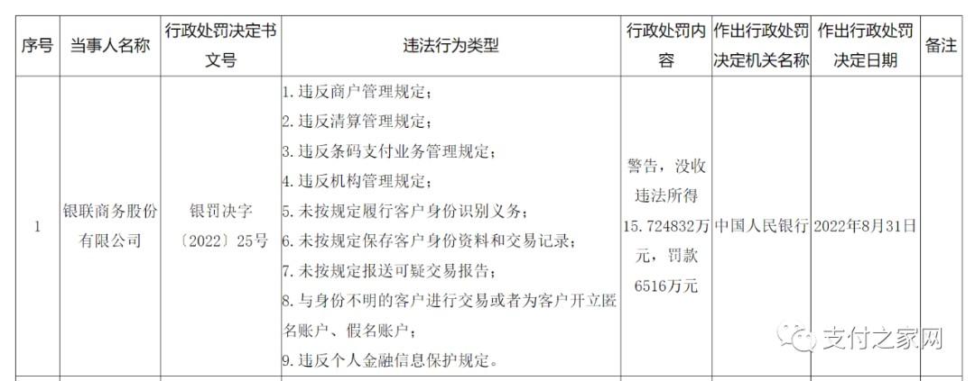 处罚事项:1.商户结算账户设置不规范;2.未按规定审核、管理特约商户档案资料,未及时更新商户信息;3.未建立落实商户培训制度;4.未按规定落实商户巡检义务;5.未能有效落实特约商户管理责任,未能有效发现客户异常情况;6.将外包商作为特约商户并受理其发起的银行卡交易;7.支付交易信息不符合真实性、完整性、可追溯性的要求;8.未遵循“了解你的客户”原则,建立健全客户身份识别机制,为非法交易直接提供支付结算服务;9.未规范建立代收业务制度;10.未按照规定履行客户身份识别义务;11.未按照规定报送可疑交易报告。