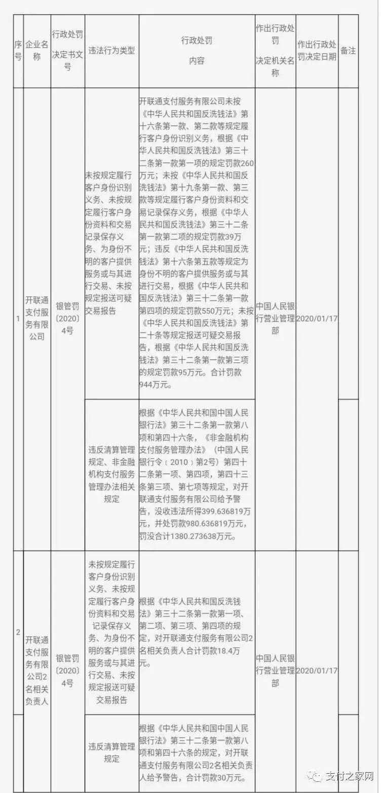 处罚金额:开联通支付服务有限公司未按《中华人民共和国反洗钱法》第十六条第一款、第二款等规定履行客户身份识别义务,根据《中华人民共和国反洗钱法》第三十二条第一款第一项的规定罚款260万元;未按《中华人民共和国反洗钱法》第十九条第一款、第三款等规定履行客户身份资料和交易记录保存义务,根据《中华人民共和国反洗钱法》第三十二条第一款第二项的规定罚款39万元;违反《中华人民共和国反洗钱法》第十六条第五款等规定为身份不明的客户提供服务或与其进行交易,根据《中华人民共和国反洗钱法》第三十二条第一款第四项的规定罚款550万元;未按《中华人民共和国反洗钱法》第二十条等规定报送可疑交易报告,根据《中华人民共和国反洗钱法》第三十二条第一款第三项的规定罚款95万元。合计罚款944万元。根据《中华人民共和国中国人民银行法》第三十二条第一款第八项和第四十六条,《非金融机构支付服务管理办法》(中国人民银行令﹝2010﹞第2号)第四十二条第一项、第四项,第四十三条第三项、第七项等规定,对开联通支付服务有限公司给予警告,没收违法所得399.636819万元,并处罚款980.636819万元,罚没合计1380.273638万元。