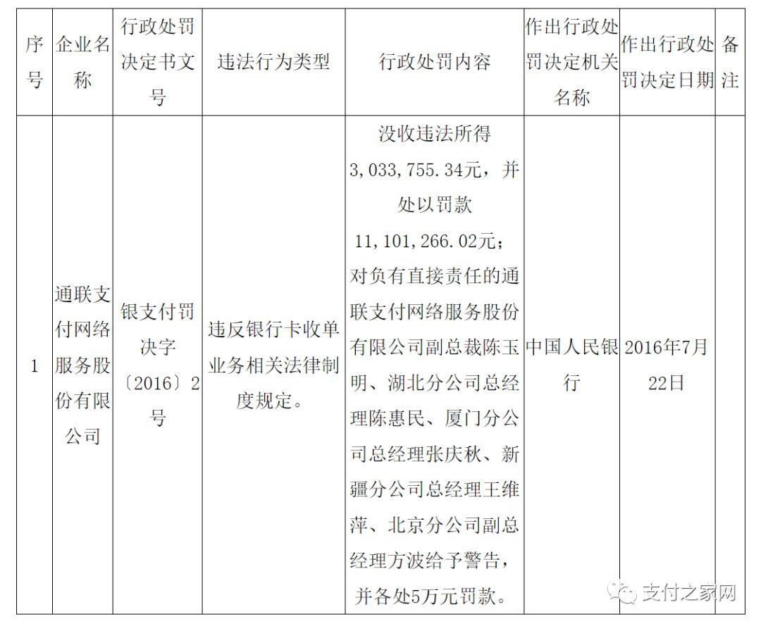 处罚决定书文号:银支付罚决字〔2016〕2号