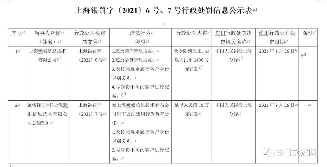 处罚决定书文号:上海银罚字〔2021〕6号