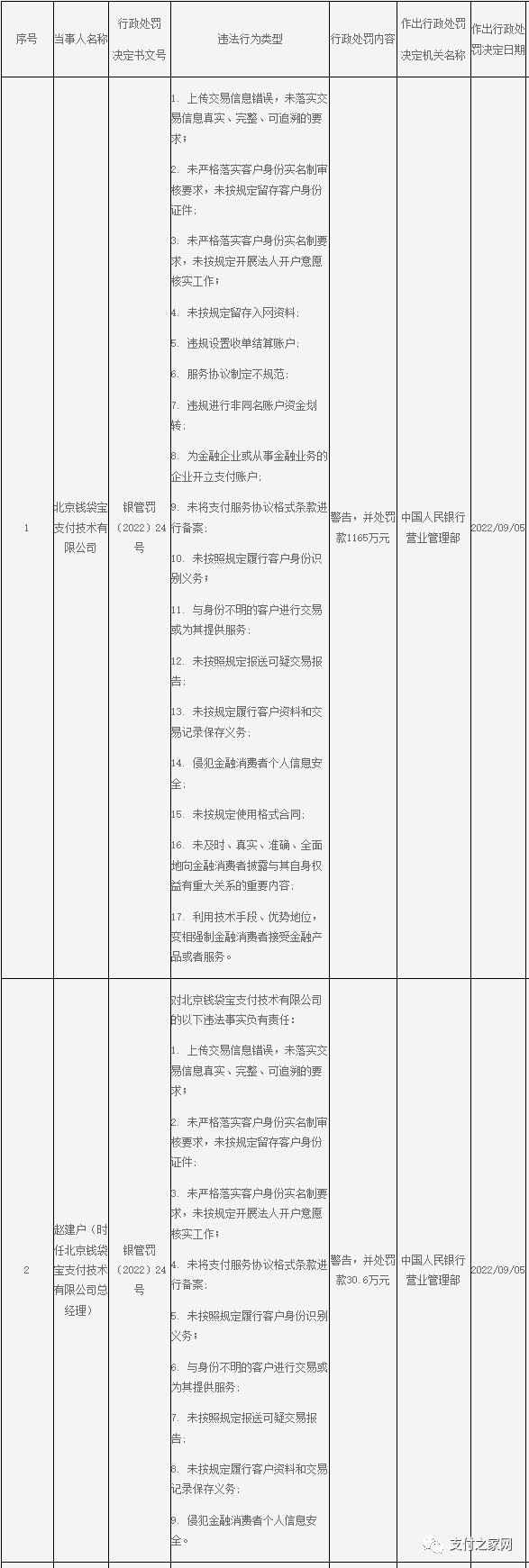 处罚事项:未按规定履行客户身份识别义务、未按规定履行客户身份资料和交易记录保存义务。违反清算管理规定、非金融机构支付服务管理办法相关规定。