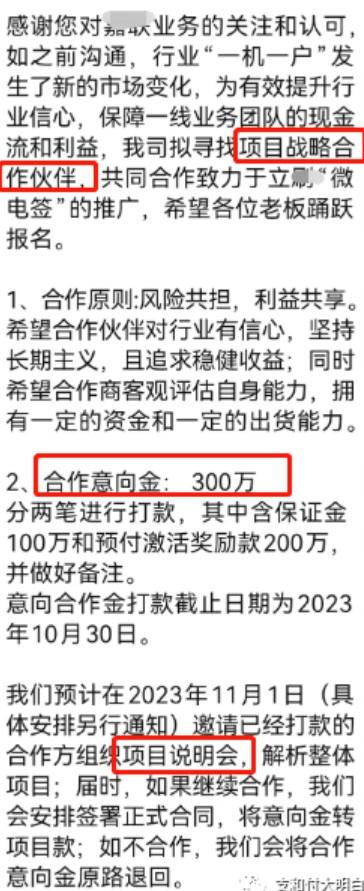 POS机代理项目战略合作伙伴,合作意向金300万,其中保证金100万和预付激活奖励款200万。据透露,这300万只是合作意向金,货款需要另外支付,合作门槛10万台起步。