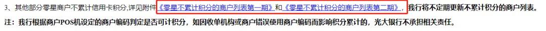 除此之外,在积分奖励细则中,我们还发现,这次光大银行也学习招商银行搞了几万个不计积分的黑名单商户,也就是我们熟知的“天书”。足以见得,现在银行对积分这块管得越来越严格了,一些撸羊毛的客户的空间也越来越少了。