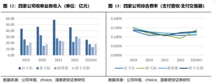 对此,国泰君安分析师分析了分析拉卡拉、新大陆、新国都、移卡四家上市公司的支付业务,各家公司的综合费率在2022年之前大致呈现下降趋势,2023年上半年,各家公司的支付费率均出现提升,取四家公司平均值,综合费率从2022年底的0.11%提升至2023H1的0.126%,收单费率呈现触底回升态势。