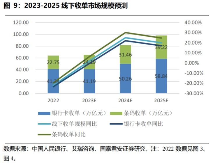 分析师预测,随着疫情影响逐渐消失,线下消费有望得到持续恢复,一定程度上增加线下收单总交易规模。但2023年支付行业监管趋严,对银行卡收单业务产生了一定影响。因此,他们预计2023年线下收单总额将实现同比微增2%至65.4万亿元,随着“一机一码”政策的边际影响减弱,经济预期改善以及消费持续恢复,线下收单市场仍会迎来增长机遇,预计2025年线下收单市场规模将达到98万亿元,比2022年增长53%。