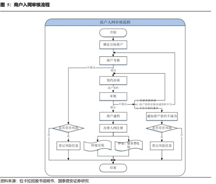 以第三方支付机构拉卡拉为例,拉卡拉主要通过自营模式和通过商户拓展服务机构的渠道拓展模式进行商户拓展,然后对商户进行筛选评估,选定符合条件的商户与其签订收单受理协议,完成签约的商户以POS机为入口,通过拉卡拉提供的交易系统开展银行卡收单业务。特约商户根据日常交易业务数据和签约费率,向拉卡拉支付手续费,手续费的支付采用代扣模式,即收单机构先行将手续费扣除后将交易清算资金净额结算至签约商户指定的账户中。