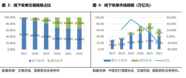 为了方便测算,我们统一选取线上线下合计数据)以及艾瑞咨询2021年发布的《2021年中国线下收单行业研究报告》和2023年发布的《2023年中国第三方支付行业研究报告》中刷卡收单和条码收单占比数据测算得出2017-2022年线下收单规模数据。根据我们测算,截至2021年,线下收单市场规模呈上升趋势,但增长速率放缓;2022年因疫情影响线下收单市场规模同比下降23.39%至64.09万亿元。