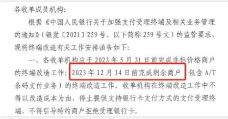 259号文中明确要求在2023年12月14日前完成剩余商户的终端改造工作。各支付公司估计在12月14日后政策执行完,会再次调整有应对方法。