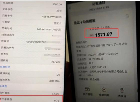 代理反馈:客户用优POS刷卡多扣了60,找上门,自己信誓旦旦的保证之后刷卡再不会多扣了。结果今天刷了1585,到账1571.69,手续费扣了13.31,啪啪打脸!