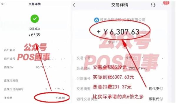 从消费者提供的消费明细里面可以看出,现代金融控股(成都)有限公司在实际消费金额6539元写出了手续费是35,97元,可实际到账却是6307.63元。扣除231.37元。费率高达3.58%,比承诺高6倍之多。