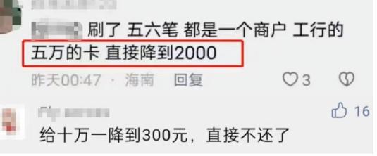 有持卡人表示,自己十万额度的卡被降到5000元,降额幅度额度之大。此外还有持卡人在同一个商户多笔刷卡,五万额度直接降到2000元。