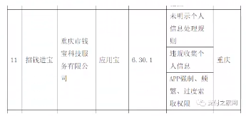 通报显示,“招钱进宝”主要存在“未明示个人信息处理规则;违规收集个人信息;APP强制、频繁、过度索取权限”的问题。