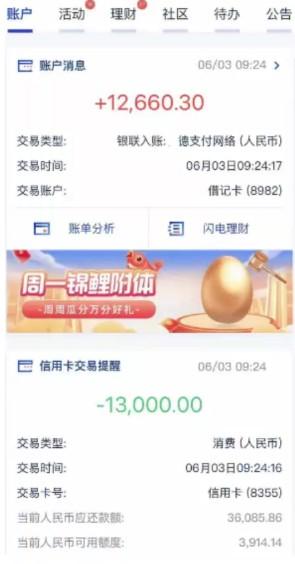 提醒大家,刷卡之前稍费点事核实下终端费率。商户刷卡13000,到账12660.3,手续费共扣除339.7元。