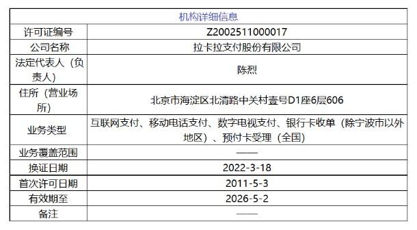 2011年首批获得中国人民银行颁发的《支付业务许可证》。2019年4月25日,拉卡拉支付在深交所成功上市,成为第一家登陆A股市场的第三方支付企业,股票代码300773。