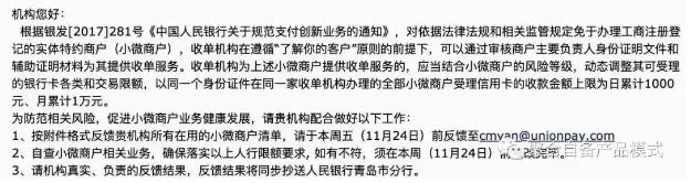 中国人民银行又下发了《关于规范支付创新业务的通知》(简称“281号文”),“281号文”强调收单业务广告内容不得使用或者变相使用“零扣率”、“低扣率”、“费率自由定义”、“商户滚动切换”、“一机多商户”、“T+0”、“D+0”、“即时到账”、“刷单”、“套现”等涉嫌不正当竞争,误导消费者或者违法违规行为的文字。