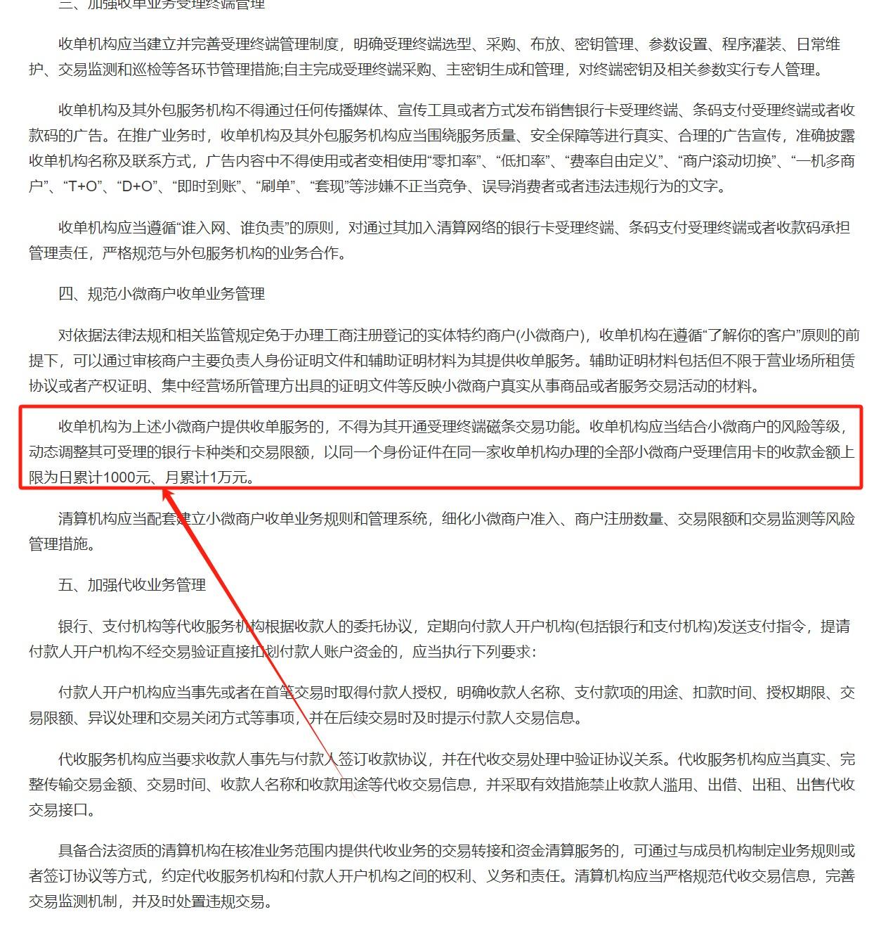 收单机构为上述小微商户提供收单服务的,不得为其开通受理终端磁条交易功能。收单机构应当结合小微商户的风险等级,动态调整其可受理的银行卡种类和交易限额,以同一个身份证件在同一家收单机构办理的全部小微商户受理信用卡的收款金额上限为日累计1000元、月累计1万元。