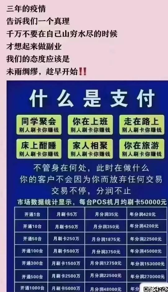 发现没有?经过几年的Y情,身边的朋友大多负债都在增加,都在使用POS机,即使你不给他机器用,他也一定在用别人的POS机刷卡。与其这个钱让别人挣不如自己挣。利用空闲时间,分享给身边的朋友用,分享10台,一年光是分润就5000+,另外每台POS机的政策返现200-300,还有办卡返佣,积分换米。这样是不是就实现了自己刷卡0费率。分享100台,完全可以实现剪卡上岸!