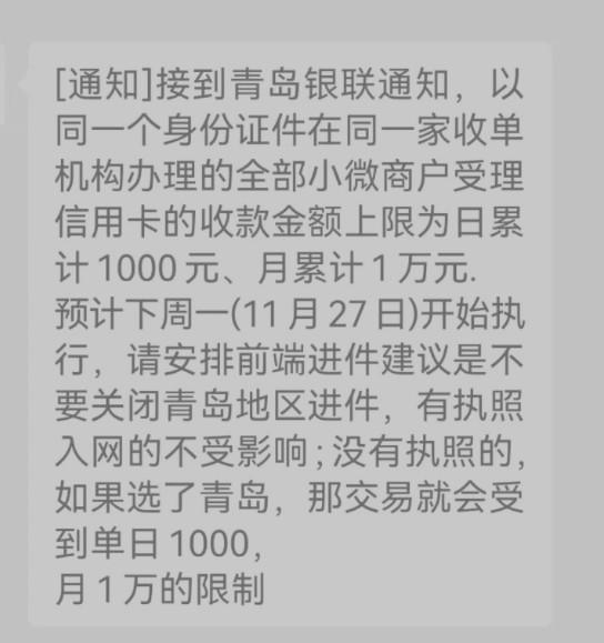 接到青岛银联通知,以同一个身份证件在同一家收单机构办理的全部小微商户受理信用卡的收款金额上限为日累计1000元、月累计1万元。