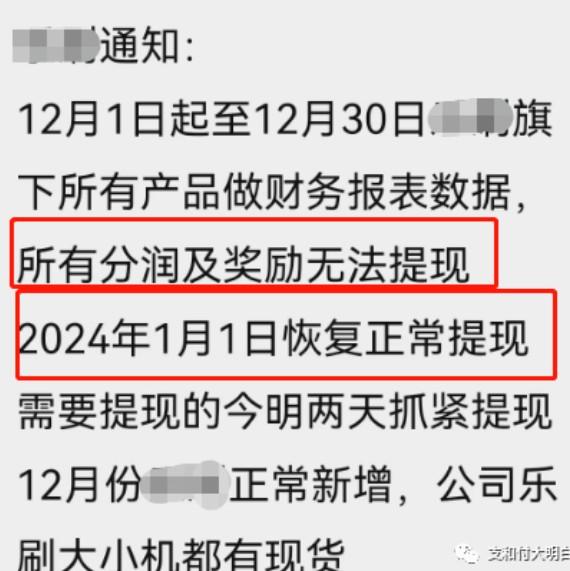 还有通知:12月1日起至12月30日所有产品做财务报表数据,所有分润及奖励无法提现,2024年1月1日恢复正常提现,需要提现的今明两天抓紧提现。