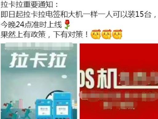 近日,拉卡拉全面落实259号文,开始全面执行一机一户。然而上有政策,下有对策。拉卡拉开放了电签和大机的限制,1个用户可以装15台。