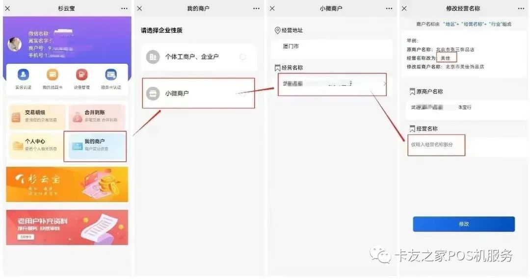 登录后首页--点击我的商户--选择商户类型--点击经营名称下面的商户名称--按举例修改经营名称