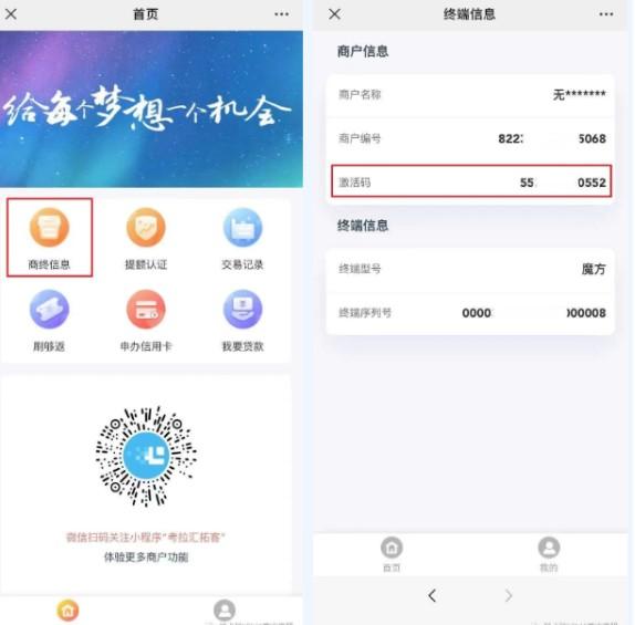 第四步:微信再次扫描机器背面二维码,输入身份证后六位进入商户版汇拓客H5页面,查询激活码