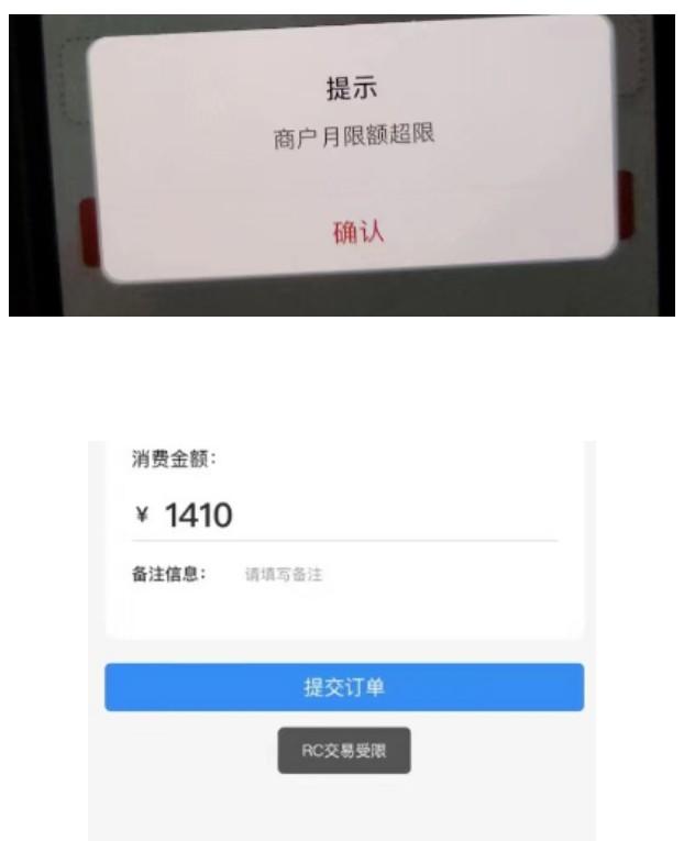 然而就在此时,有代理商曝料称,旗下多款聚合产品受到影响,客户交易时出现报错“商户月限额超限”“RC交易受限”。