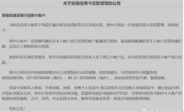 11月19号,浦发银行发布一则关于加强信用卡还款管理的公告,公告显示浦发银行信用卡中心将对一定周期内通过非本人账户进行还款的账户数量进行限制,其中超出限制的数量的非本人账户还款将被银行拦截,无法计入持卡人的信用卡还款。