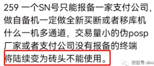 259落地,不符合政策规定的机器都将被停止使用,其中:蓝牙机MPOS,更改SN,或者更换支付公司的机器,以及POSP下的自备机!