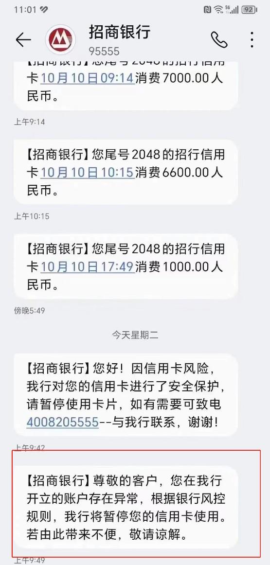 招商银行:根据银行风控规则,将暂停信用卡使用。