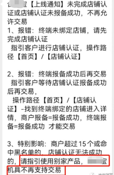 此前某POS机代理商的通知中就明确提醒:商户超过15个或名字黑名单的,请指引使用别家产品,我们的产品不再支持交易。