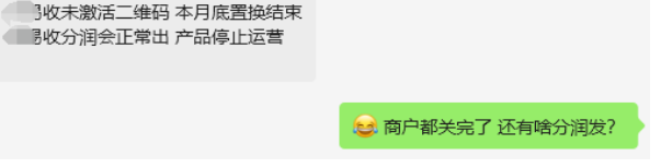 一损皆损,旗下代理商也跟着分润归零,大佬也没办法只能回收未激活的二维码置换其他产品,帮代理商减少点损失。