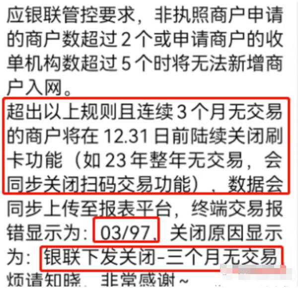 由于银联的管理规定,当一个非执照商户申请超过2个商户或超过5个收单机构的商户时,将无法新增商户入网。此外,对于连续3个月无交易的商户,将在今年12月31日前陆续关闭刷卡功能。如果商户在2023年全年内都没有任何交易,其扫码交易功能也将被关闭。这些关闭的商户数据将会同步上传至报表平台,终端交易报错代码为03/97,关闭原因为“银联下发关闭-三个月无交易”。