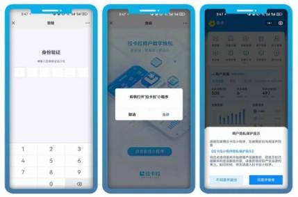 5、随之会跳转至需要输入【身份证后六位],弹出【拉卡拉商户数字钱包】点击前往小程序,会弹出【用户隐私保护提示]点击同意并继续。