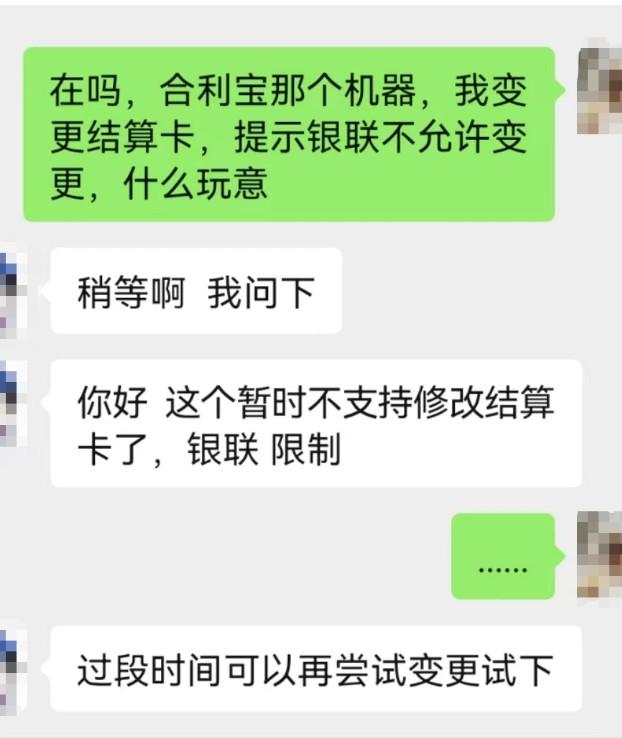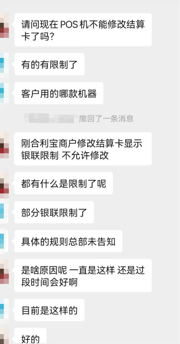 今天,有代理商向小编爆料,合利宝旗下POS产品,被银联限制,不允许变更结算卡。具体被限制多久目前未知,对接只回复过段时间可以尝试变更。
