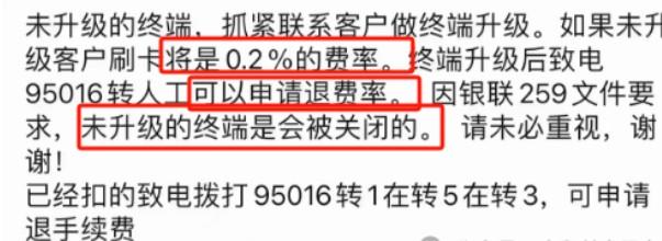 但是也不要慌,如果未升级并且扣了2%的手续费,升级后可以申请退还,未升级的终端是会被关闭的。