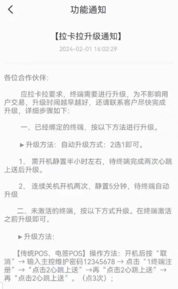 不局限于某个盘某个机构,只要是拉卡拉的机器,一定要先升级再使用!目前已有代理商接到通知,没有升级的终端费率已经上调了。