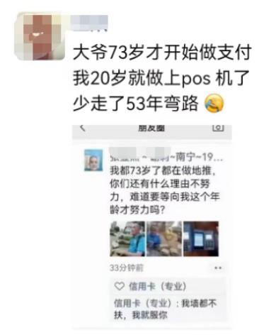 73岁大爷单日激活7台POS机 zhangyu 2年前 ( 2024-02-23 ) 315 近日支付行业出现了一批大爷,活成了莫欺老年穷的榜样。73岁的张大爷,发朋友圈说:我都73岁了,都在做地推,你们还有什么理由不努力,难道要等我这个年龄才努力吗?今天被这个大爷刷屏了,很多人感慨:大爷73岁才开始做支付,我20岁就做上了POS机了,少走了53年弯路。 The End 标签:博主很懒,并没有设置标签