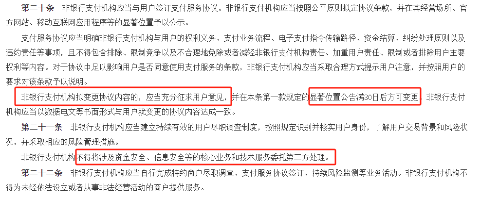 其中要求:非银机构拟变更协议内容的,应当充分征求用户意见,并在显著位置公告满30日后方可变更。核心业务,不得委托第三方处理。