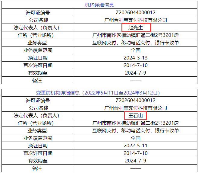 广州合利宝支付科技有限公司法人王石山变更为赵光生