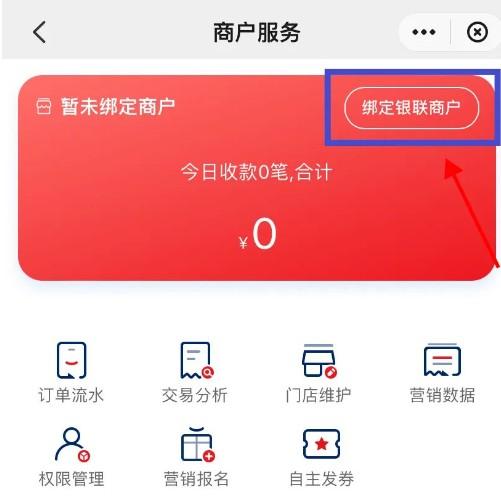 第四步:点开“商户服务”以后,会出现一个上述图片的页面,右上角有一个“绑定银联商户”,直接点击“绑定银联商户”