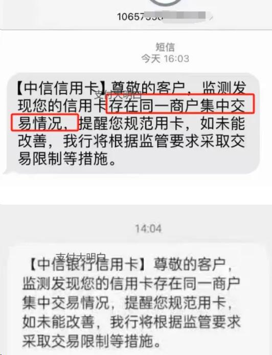 中信银行提醒:尊敬的客户,监测发现您的信用卡存在同一商户集中交易情况,提醒您规范用卡,如未能改善,我行将根据监管要求采取交易限制等措施。
